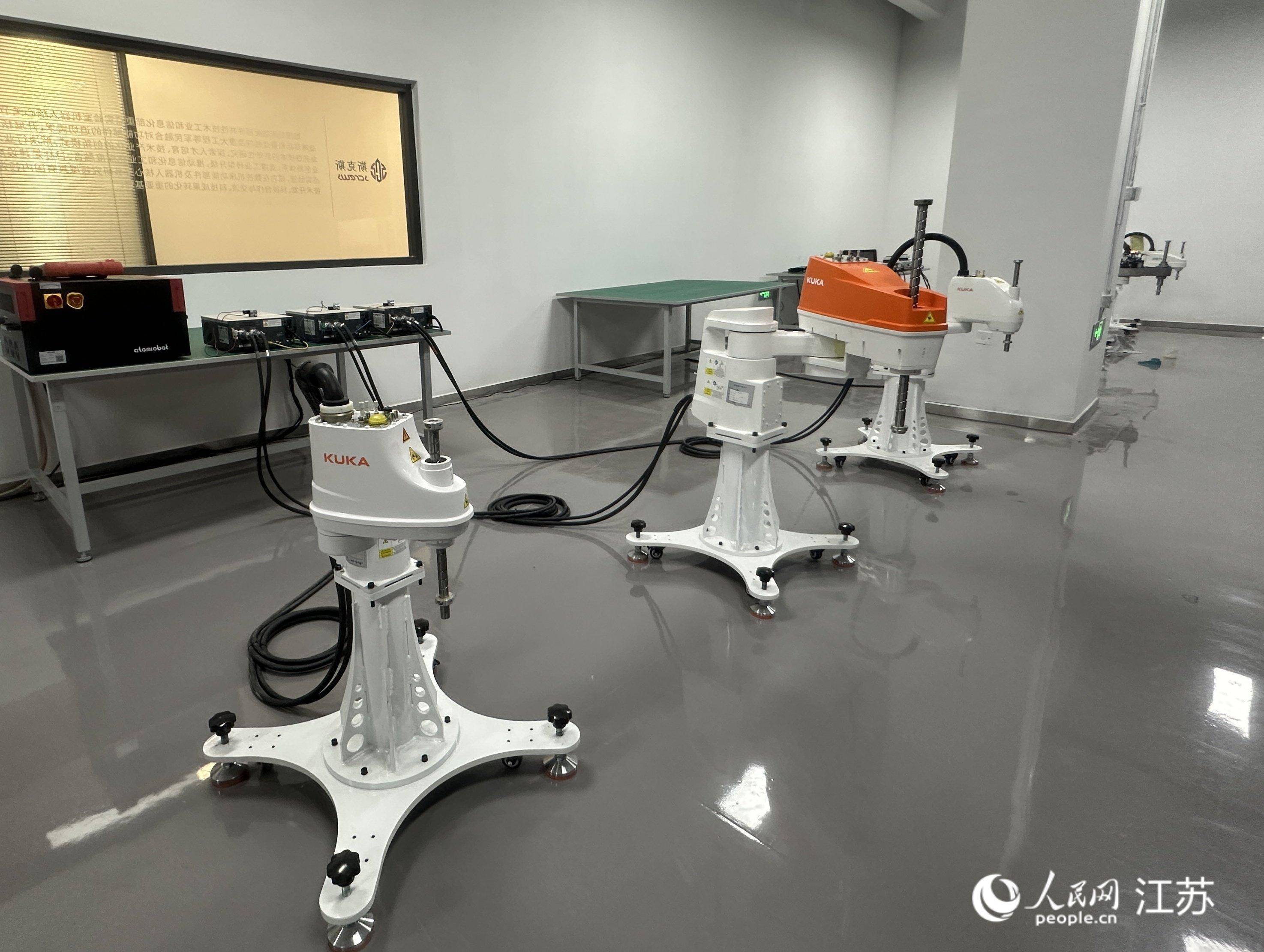 工业机器人的“关节”处,即为银色的金属丝杠。人民网 赵登岩摄