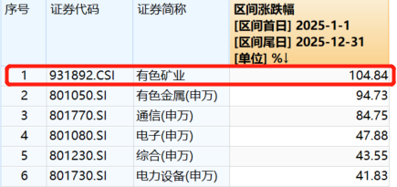 在2025年有色金属板块的强劲行情中,聚焦于产业链最上游矿产资源环节的指数表现出了更高的弹性。以有色矿业ETF招商(159690)所跟踪的中证有色金属矿业主题指数为例,该指数在2025年全年涨幅达104.84%,显著跑赢了同期上涨94.73%的申万一级有色金属行业指数。